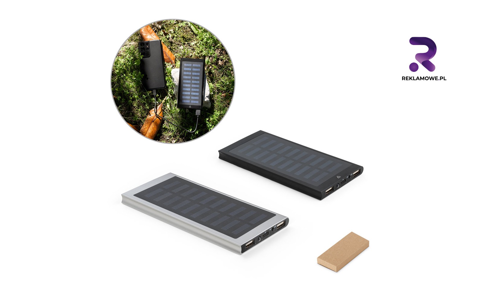 - Powerbanki solarne – wyposażone w panele fotowoltaiczne, ładują się energią słoneczną, więc sprawdzają się na wyjazdach i imprezach outdoor. Ekologiczne zasilanie buduje wizerunek marki dbającej o planetę.